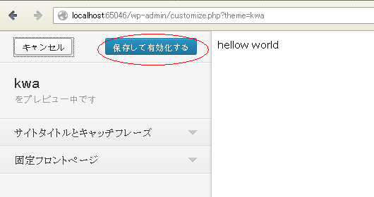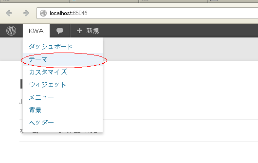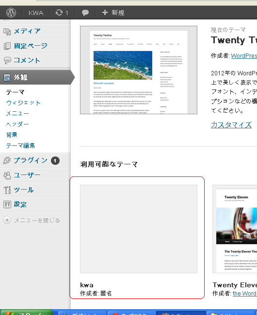 今度はWebブラウザからWordPressの管理画面のテーマを選んでください。利用可能なthemeとしてkwaが表示されています。WordPressがthemeとして認識したのです。