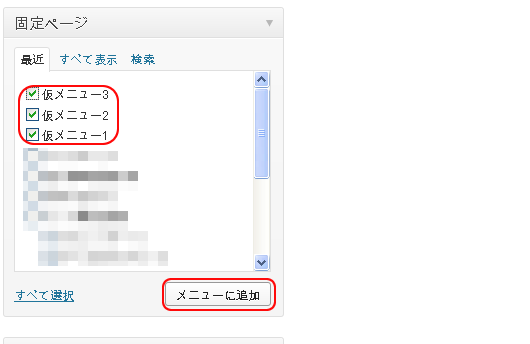 仮メニュー2、仮メニュー3も同様に固定ページを追加します。