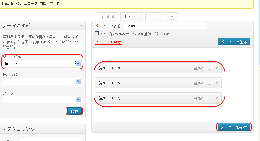 今度は”header”メニューに先ほど追加した”仮メニュー1~3″を紐付けします。