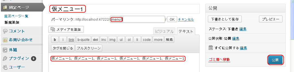 次に固定ページ投稿画面で画面の様に仮メニュー1を投稿します。